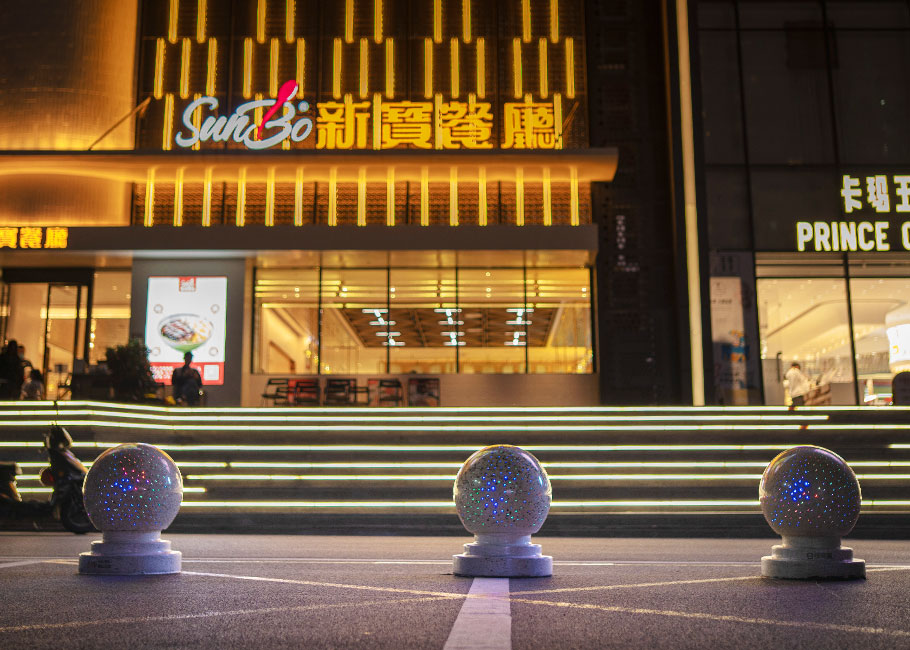 新型路障石材具有擋車功能,提升場所的形象和安全性,夜晚展現(xiàn)出特別絢麗的效果